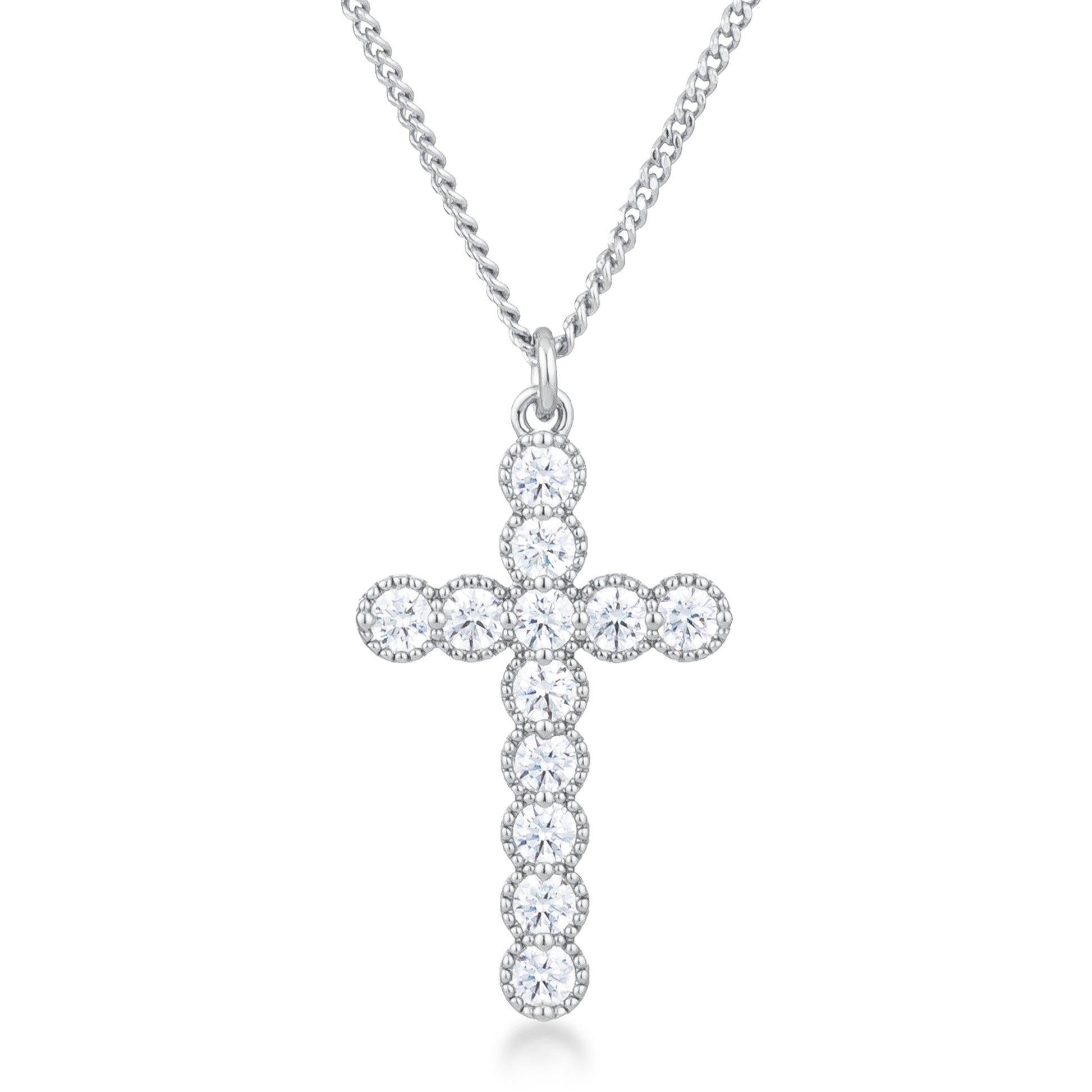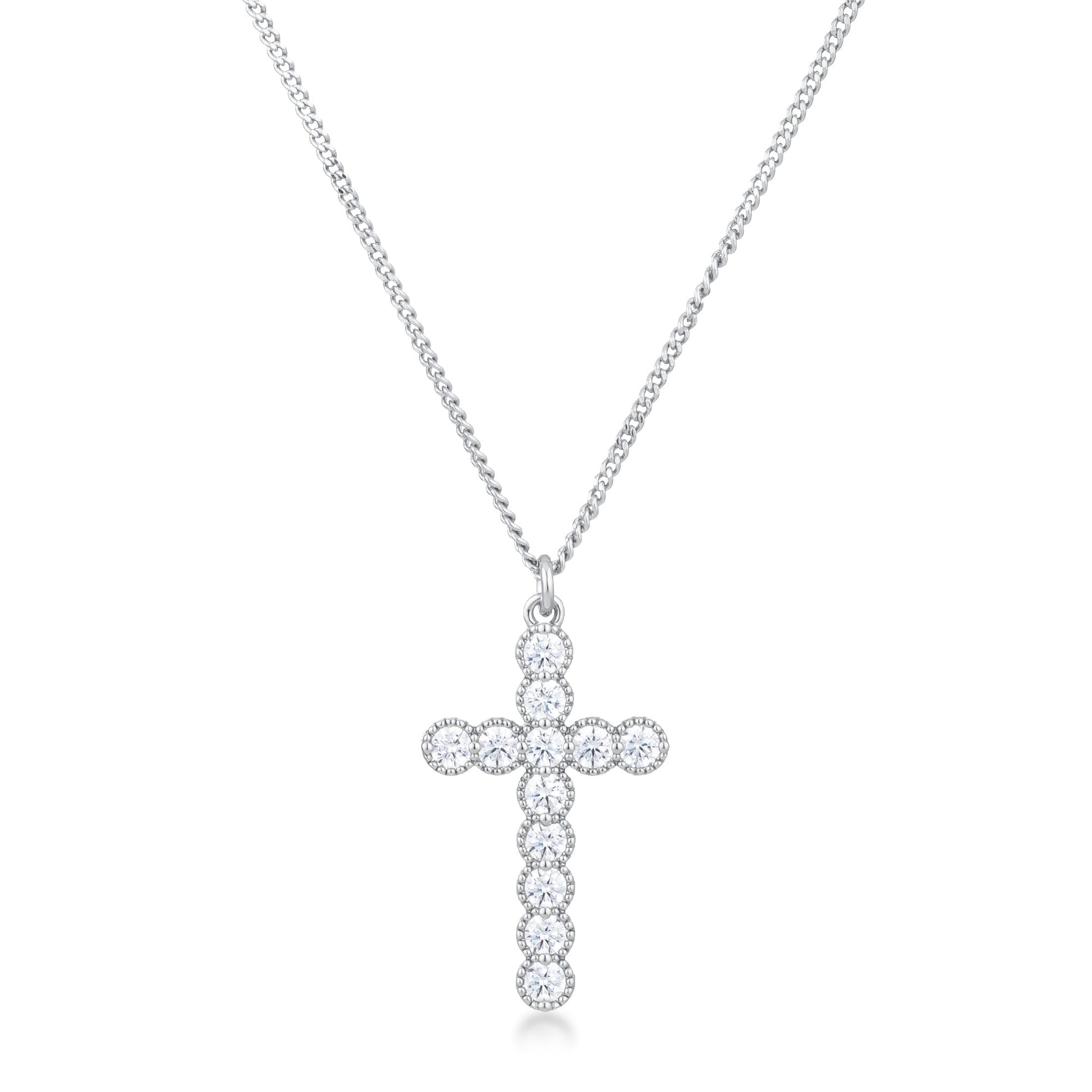 Micro Beaded Rhodium Plated Clear CZ Cross Pendant