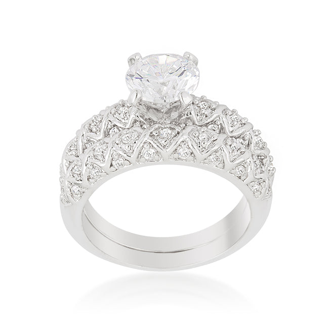 Elegant style is on display with this fabulous wedding set. Genuine Rhodium Plating is achieved using an electroplating process that coats the item with heavy layers of rhodium a close cousin to platinum which gives our jewelry a platinum luster.