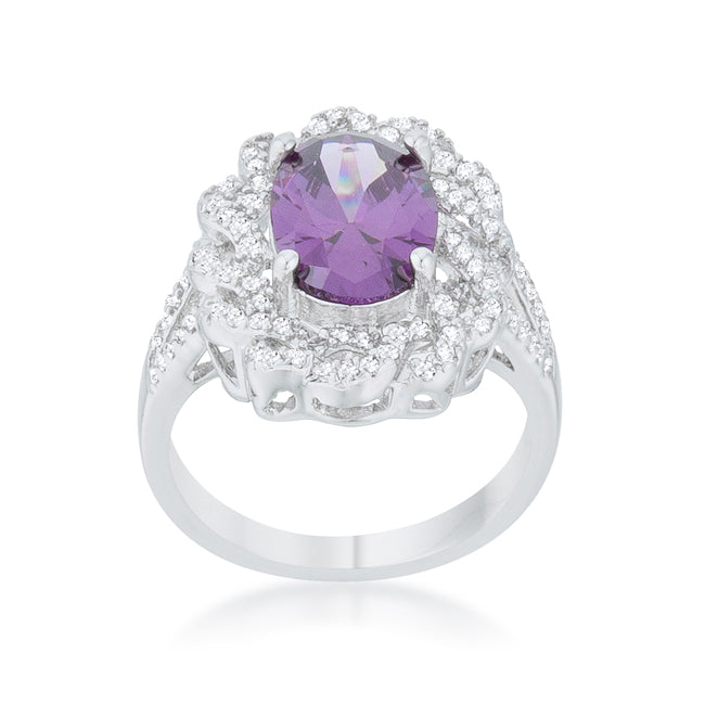 Clear finely cut stones twist in an elegant design accenting an amethyst center stone in this classic 8.5 carat ring. Our genuine rhodium finish is achieved using an electroplating process that coats the item with heavy layers of rhodium a close cousin to platinum. This gives our jewelry a platinum luster.