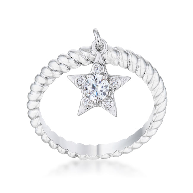 This ring is crafted with rhodium plating the same thing that gives white gold its incredible shine. With five round cubic zirconia accented points and a larger round cubic zirconia in the center the charm sparkles to add to the effect. This is the perfect gift for the star of your life!