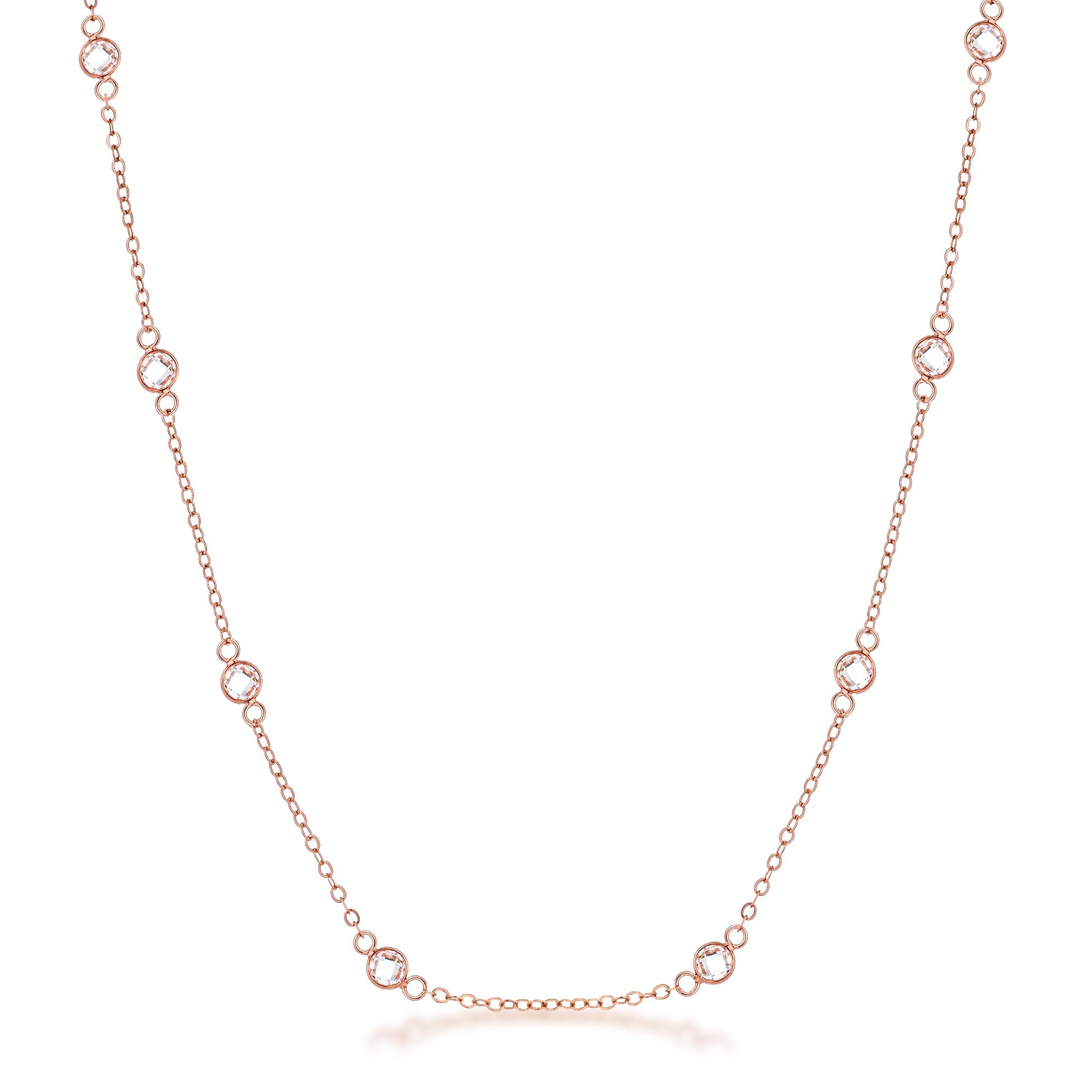 A polished and versatile chain coated in Rose Gold defines daily elegance. Multiple spaced round bezel clear Cubic Zirconia stones offer a muted touch of dainty femininity ideal for completing an outfit with a dash of brilliance. A 2-inch extender offers its wearer options to add optional length to complement any neckline. A dash of pink hue will add warmth and color to a glowing complexion.