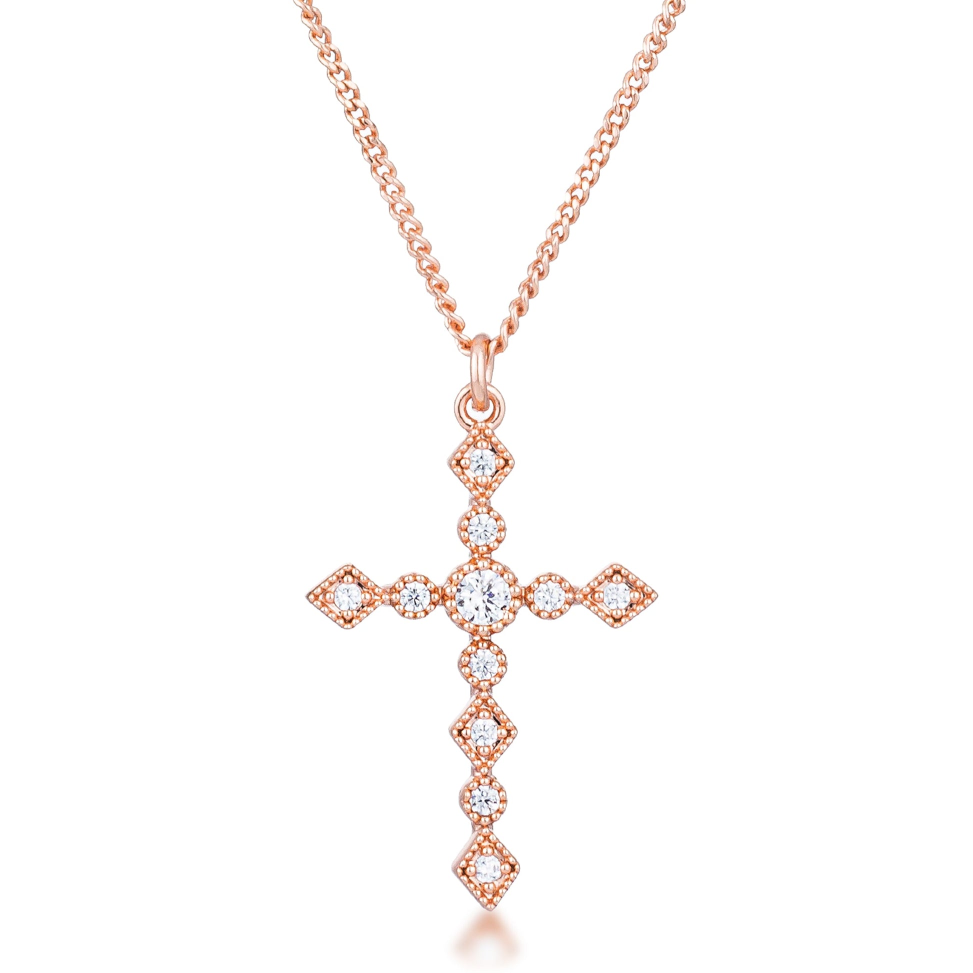 Dainty Art Deco Rose Gold Plated Clear CZ Cross Pendant Necklace