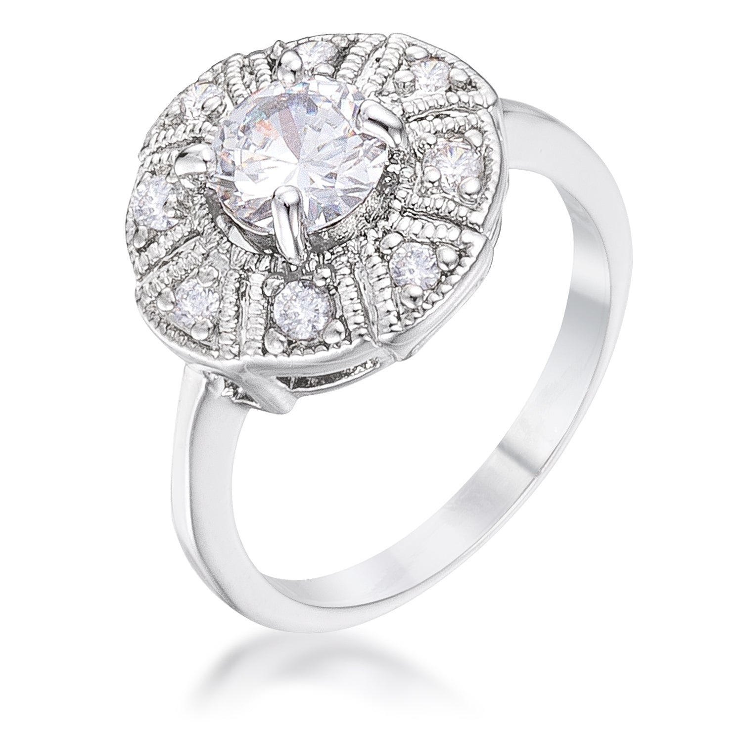 The Queen Mary features a milgrain style antique face with pave cubic zirconia circling a round cubic zircon center in silver tone. Its antique design makes it rich with expression and old flavor. Genuine Rhodium Plating is achieved using an electroplating process that coats the item with heavy layers of rhodium a close cousin to platinum which gives this piece a platinum luster.