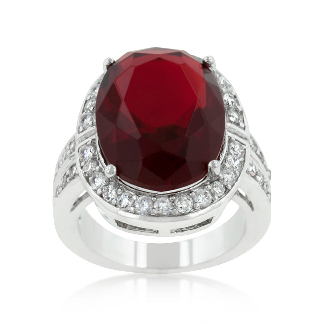 Make a statement with our Ruby Red Cocktail Ring! Our genuine rhodium finish is achieved using an electroplating process that coats the item with heavy layers of rhodium a close cousin to platinum which gives our jewelry a platinum luster.