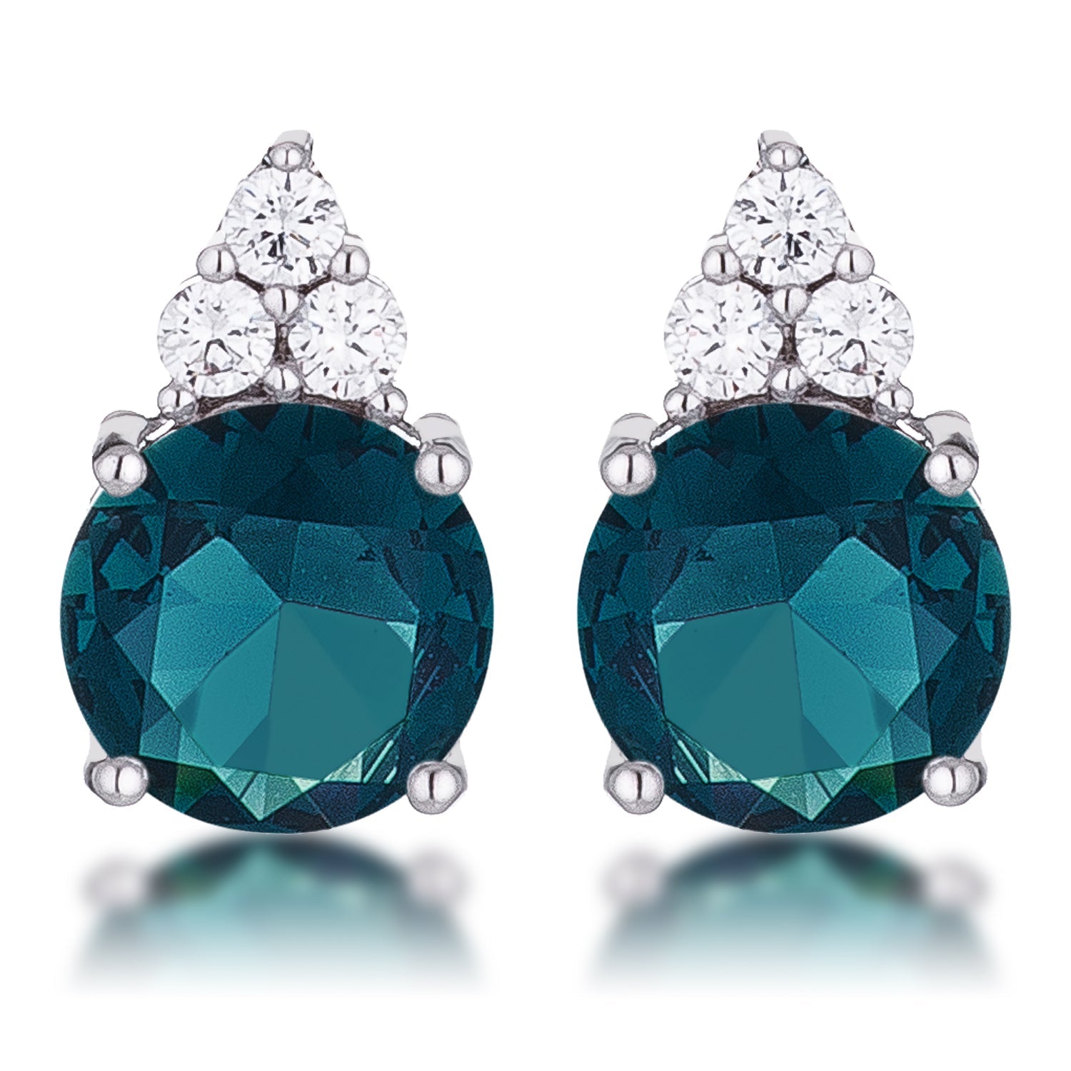 These simple yet elegant earrings feature a mesmerizing blue green stone. A trio of glistening white cubic zirconia rests atop the eye-catching round peacock green sparkler. These earrings are bathed in a beautiful rhodium finish for a brilliant shine and is a classic piece you will treasure for a long time.